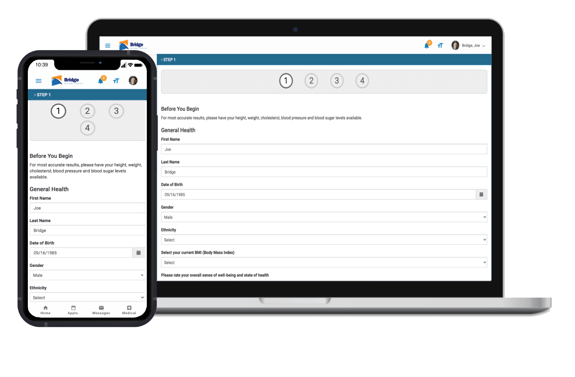 Save your practice an extra step and have patients fill out forms conveniently online with patient forms software. Bridge can autofill fields based on what it already knows about a patient and previous forms submitted. Collect satisfaction surveys, general health assessments, and any other type of form sent through the patient portal directly back into your source system.